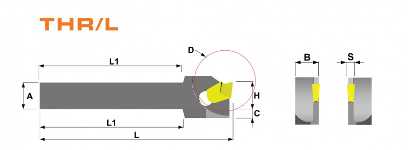 THR/L mounts GTN inserts; any thickness of the holder's blade fits a specific size of insert; for example THR 16-4 fits GTN 4 or GTR 4 inserts.